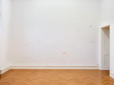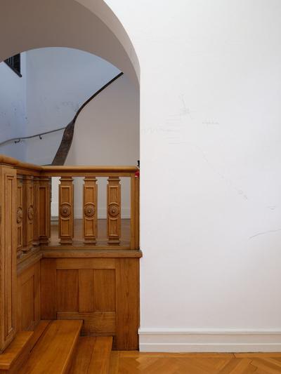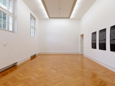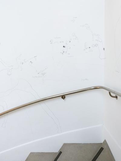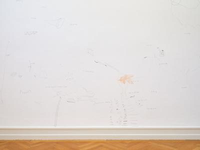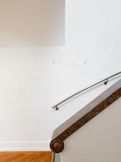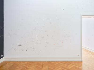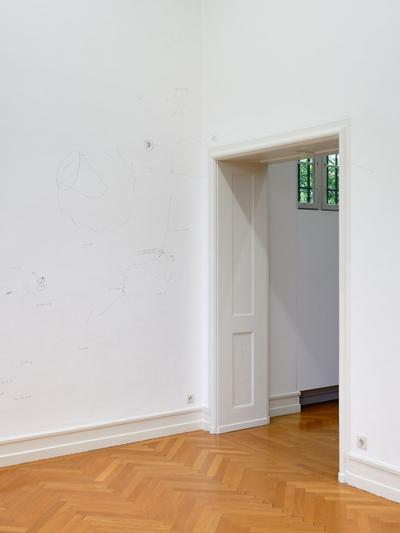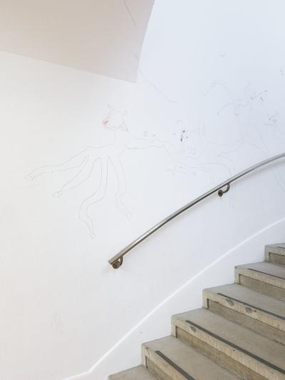 Olivia Abächerli (*1992) received the main grant of the Aeschlimann Corti Scholarship for her wall painting the centre and the other (2023), in May 2024. Starting from her original work, she draws directly onto the white walls of the Kunsthalle Bern during opening hours, usually on Wednesday afternoons. The continuous and open working process allows the artist to respond to current events and to connect with the public.