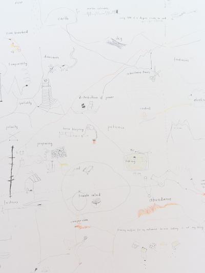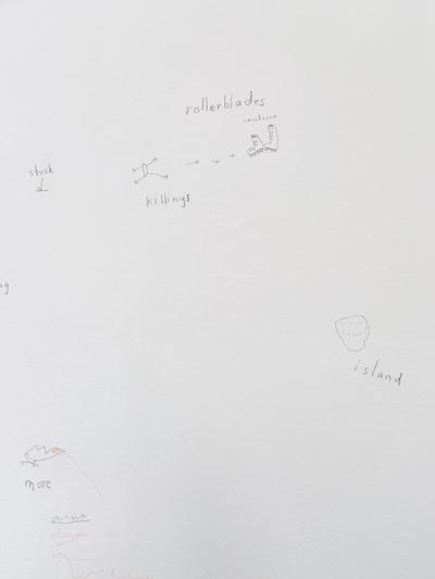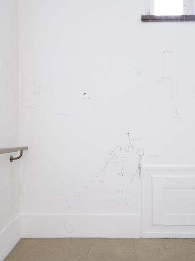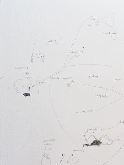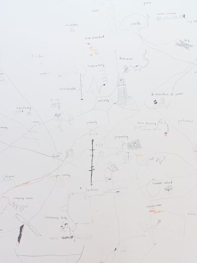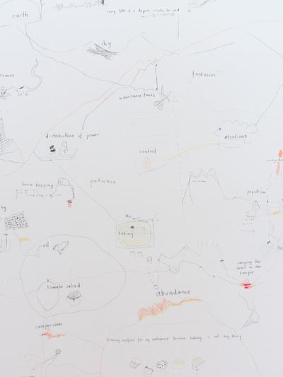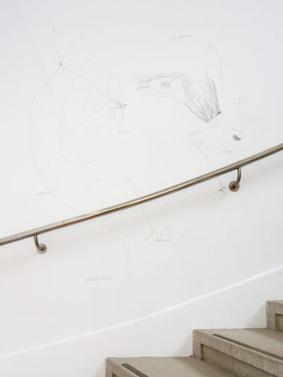 Olivia Abächerli’s work often contains cartographic elements, a means of communicating information in a spatially focused manner. Her practice includes video animations, wall paintings, as well as drawings, which usually take the form of a mind map. It is a compilation of terms, explanations, symbols and questions that concern the artist herself. First presented at the Kunsthalle Luzern in 2023 and then at the Kunsthalle Bern in May 2024 as part of the Aeschliman Corti-Stipendium exhibition, the work is now being expanded while reassessing the original mural seen on the ground floor of the institution. The piece shows the entanglement of the global and the personal and presents this as an exemplary subjectivity. At the same time, the artist shows the interconnectedness between the big themes of contemporary life: queerness and identity, care labour, concepts of nationhood, colonialism, racism, pollution and the mundane of everyday life in Switzerland. What we see on the wall also relates, in a non-hierarchical way, to the urgent planetary questions of citizens around the world, and to the repercussions of everything. This way of working allows us to connect and find themes to engage with and expand on.