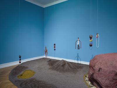 In der Kunsthalle Bern zeigt sie eine eigens für die Ausstellung entwickelte, raumgreifende Installation, die sich mit europäischen Sammlungen sogenannter «crafted children» beschäftigt – in der westlichen Ethnografie als Fruchtbarkeitspuppen bezeichnet. Das Wiederherstellen von Fruchtbarkeitskanälen versteht Mekondjo als einen Akt der Heilung und als Möglichkeit, sich mit ihren Ahn:innen zu verbinden und ihnen zu gedenken. Sie rekonstruiert diese Figuren, die einst eine symbolische Rolle für Frauen spielten: den Kinderwunsch zu verkörpern. Heute sind sie nur noch in ethnografischen Museumssammlungen zu finden. In der Schweiz stellte das Musée d’ethnographie de Neuchâtel – mit dem die Künstlerin und die Kunsthalle Bern für diese Ausstellung zusammenarbeiteten – eine der seltenen namentlich überlieferten Figuren zur Verfügung: Nadula.